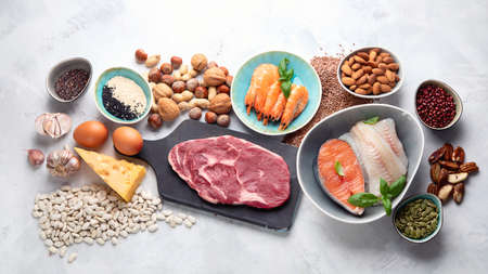 Assortment of healthy protein source and body building food. Meat beef salmon chicken breast eggs dairy products cheese yogurt beans artichokes broccoli nuts oat meal. Top view flat lay