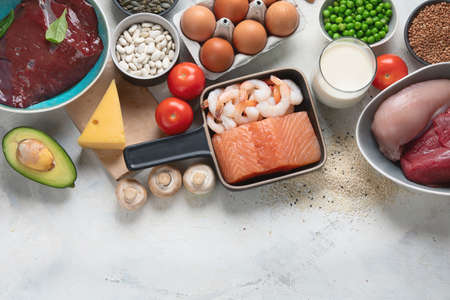 A set of natural products rich in vitamin B12 cobalamin. Healthy food concept.