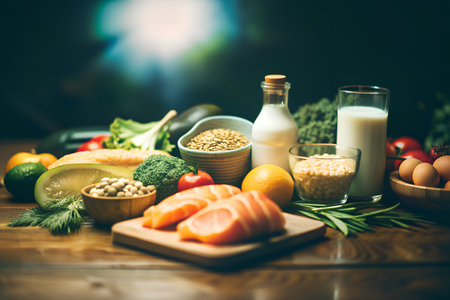 Assorted healthy foods including salmon, fruits, vegetables, nuts, and dairy products creatively displayed on a wooden table.