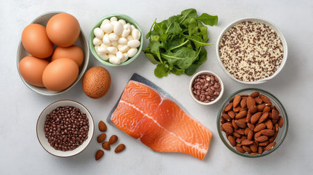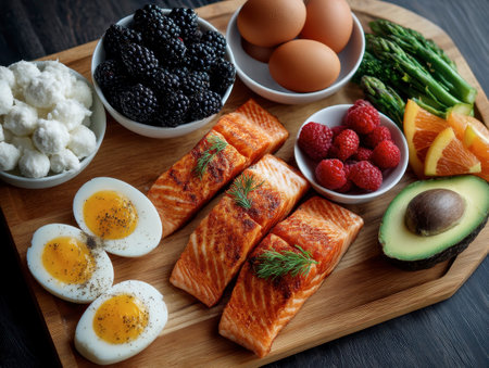 A vibrant collection of fresh ingredients, including salmon, eggs, broccoli, and berries, arranged beautifully for healthy cooking and meal preparation.