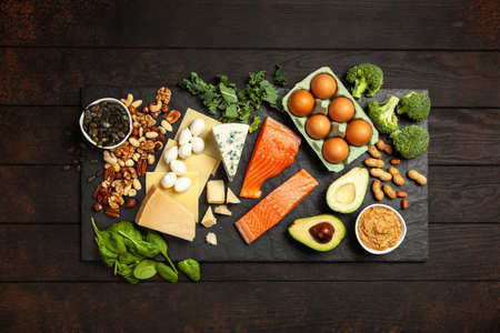 Table top view of healthy ketogenic diet foods. Wooden background, copy space.