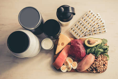 Bottles of sport nutrition and healthy food containing a lot of protein for sports people