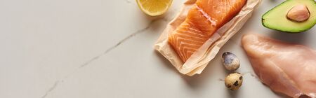 Panoramic shot of raw chicken breast near salmon on parchment paper, quail eggs, avocado and lemon on marble surface