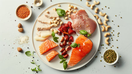 a plate, featuring a mouthwatering assortment of chicken, meat, tofu, salmon fish, nuts, and lentils, with ample empty space invitingly left for text or captions