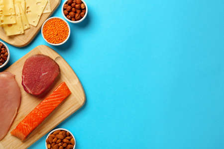 Different fresh products on light blue background, flat lay and space for text. Sources of essential amino acids