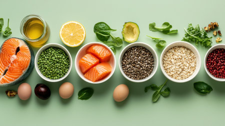 Explore a vibrant display of fresh ingredients including salmon, greens, and legumes for nutritious meal preparation. Perfect for cooking enthusiasts and healthy living advocates.