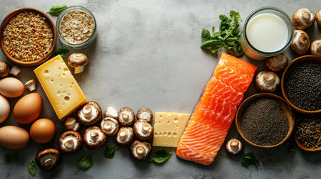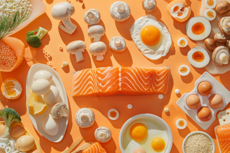 An artistically arranged assortment of foods rich in Vitamin D, including salmon, mushrooms, and citrus, presented as a feast for the eyes.