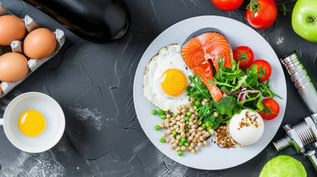 This image showcases a healthy and vibrant meal featuring salmon, eggs, fresh vegetables, and nuts, beautifully arranged on a slate table, perfect for nutrition enthusiasts.
