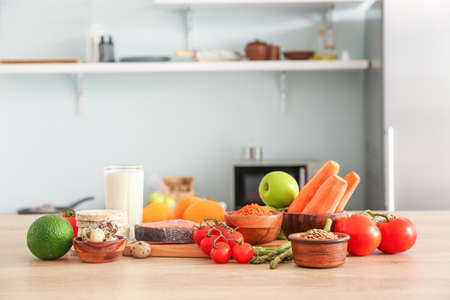 Different healthy food on table in kitchen