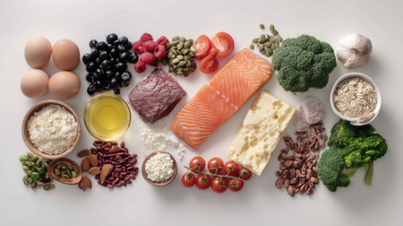 A stunning arrangement of fresh ingredients on a white background, showcasing salmon, pork, eggs, nuts, and more, ideal for healthy meal preparation.