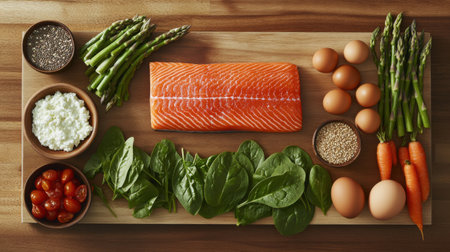 A wooden cutting board displays a vibrant assortment of fresh ingredients, including salmon, asparagus, spinach, cherry tomatoes, eggs, and sesame seeds, ready for meal preparation.