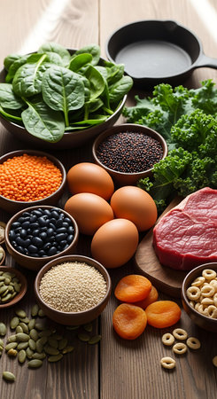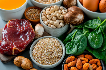 A fresh spread of vitamin B-rich foods like legumes, meats, and dairy, laid out on a kitchen counter with a bright, healthy vibe