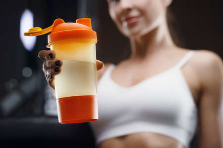 Front view on hands of unknown caucasian woman female athlete holding plastic bottle supplement shaker while training at gym real people copy space