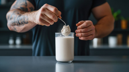 A man pours whey protein shakes to blue. Whey protein, a healthy lifestyle, a person pours whey powder on a bun. And scoop dry mix in man's hands