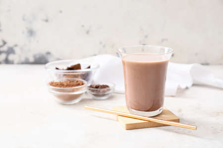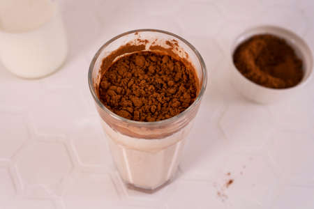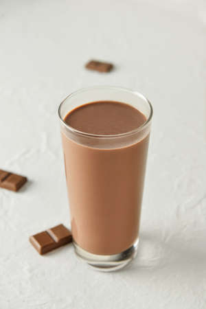 Delicious homemade cocoa drink with milk, cocoa powder and pieces of chocolate bar.
