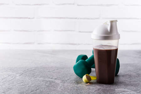 Chocolate protein shake and dumbbells on gray stone. Copyspace