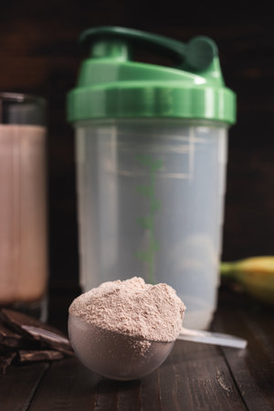 Plastic measuring spoon with whey protein powder, chocolate cubes, shaker for prepare milkshake cocktail or protein drink and banana fruit on a dark wooden background.