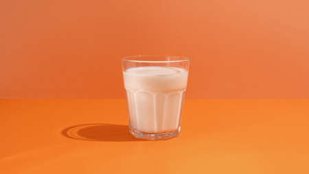 Close up of glass with white cocktail and straw. Protein shake on the counter in sports bar. Banks with sports nutrition background. fitness drinks. Free space for text.