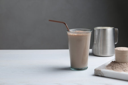 Glass with protein shake and scoop of powder on white wooden table. Space for text