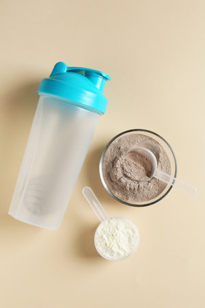 Protein powder in bowl, scoops and shaker on beige background, flat lay
