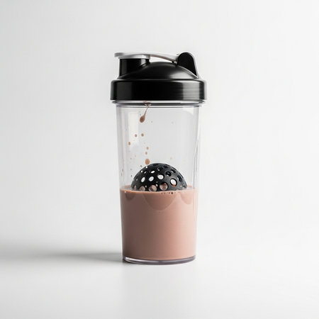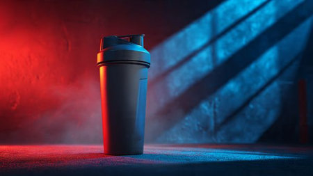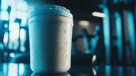 Healthy protein shake on a table in a modern gym setting during an afternoon workout session