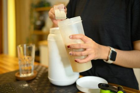 Young asian woman preparing protein shake after home workout in a kitchen.