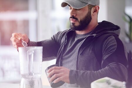 healthy eating concept of diet of strong young athlete man in a cap and sportswear filling measuring cup with protein in sports fitness club