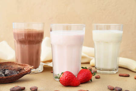 Traditional indian spiced drinks Mango lassi and Strawberry Lassi in glass cups on grey neutral background, copy space