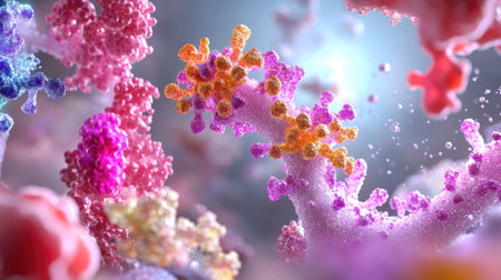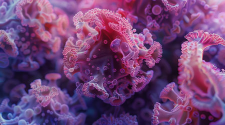 This vibrant image showcases an abstract view of microscopic biological structures, featuring a blend of colors and textures. Ideal for science and creativity.