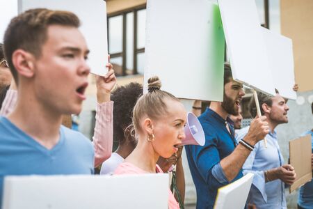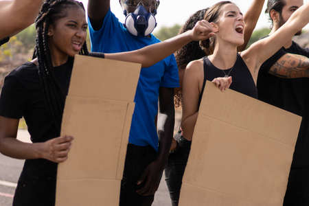 Angry diverse group of young activists holding blank signs and shouting during a political protest demonstration
