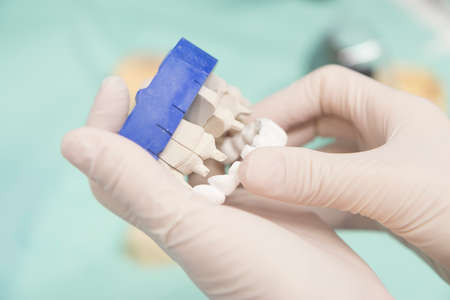 Dental bridge in the hands of a dentist. Close-up