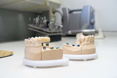 Dental prosthetics, implants. Gypsum model on the table at the dentist.