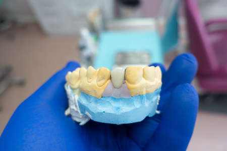 close-up ceramic tooth crown on a plaster model of teeth in the dentist's hand. work of a dental technician