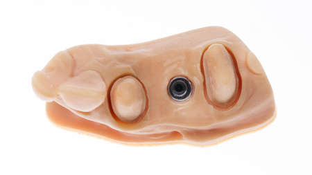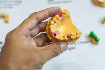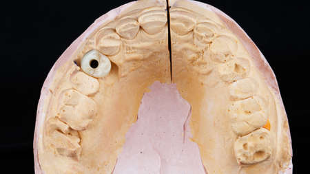 Dental prosthesis in semiprocess. Test of artificial tooth prosthetic, handmade modern dental ceramics implantat. The denture, false teeth.