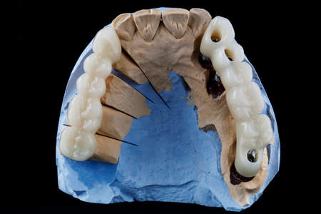 Fitting the long zirconia​ bridge​ in the plaster model for dental Treatment​ on black background.