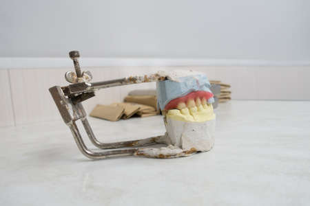 Broken acrylic denture. Dental phantom. Selective focus photo.