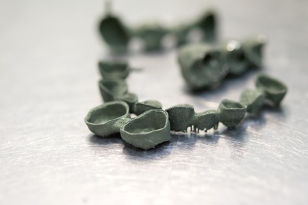 Tooth dental crowns created on 3d printer for metal way selective Laser Melting. Model created in laser sintering machine. DMLS, SLM, SLS additive technology. Concept of 4.0 industrial revolution.