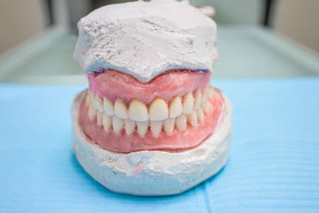 Gypsum models of dentures on the table close-up. Dental prosthetics, orthopedic dentistry