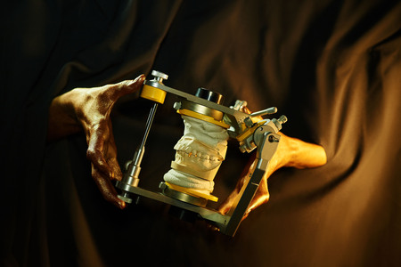 Articulator for teeth modeling. Dental articulators fixed dentures. Die-cast aluminum anatomical articulator. Dental equipment. Dentistry tools development of prostheses. Equipment dental prosthetist