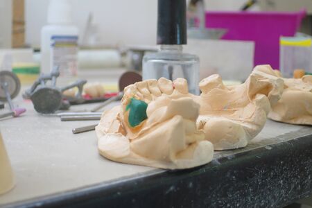 Dental prosthesis, dentures, prosthetics work. A study and a table with dental tools