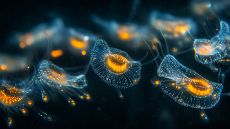 Close-up of bioluminescent jellyfish in an underwater environment.