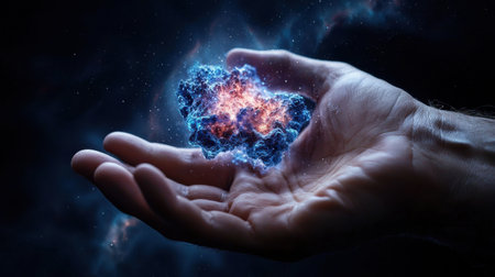 A hand holding a glowing blue object in a dark background. The object is surrounded by a blue and orange glow, giving it a sense of otherworldly beauty
