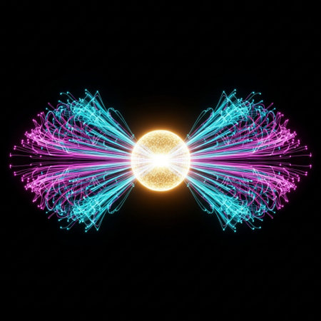 Abstract vibrant burst, lens flare, central sphere, night scene