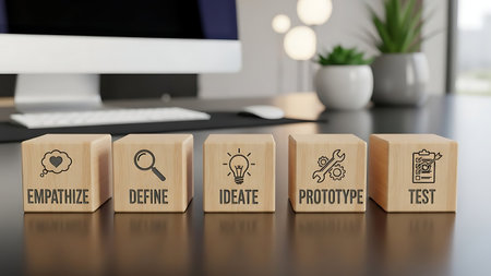 A collaborative workspace shows a diverse team engaged in user interface design. Various devices and notes spread out showcase brainstorming and innovative planning processes.
