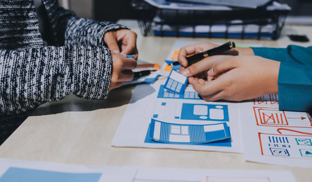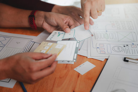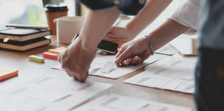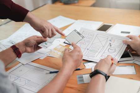 Graphic designers work together with UX UI designer planning application template layout framework for mobile phone computer mobile