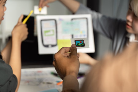 Group of young adult multiethnic men and women collaborating on mobile app interface design, holding wireframe sketches and discussing project details around table in office