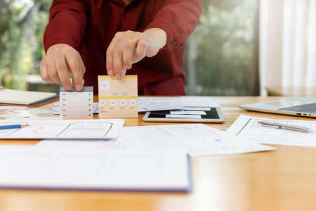 user experience UX designer designing web on smart phone layout. UI planning mobile application. developer work with business prototype