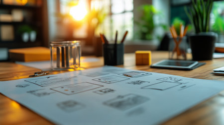 A well-organized workspace captures sketches on paper, various tools, and warm sunlight streaming through windows, creating an inviting atmosphere for creativity.