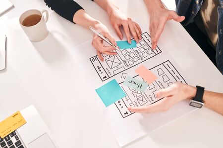 Above view of app interface designer making sticky notes on scheme while planning menu design in office