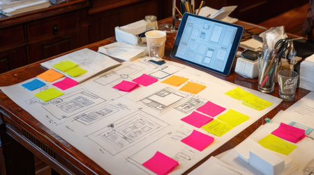 Brainstorming table filled with sticky notes, flowcharts, and digital tablets in use